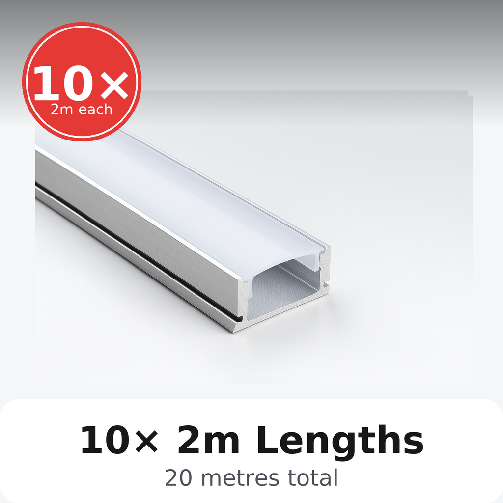 Sleek, safe and simple—this aluminium housing keeps your LED tape straight, dissipates heat for longer lifespan, and the snap-fit diffuser softens hotspots for a continuous light line. Ideal for under-cabinet, alcove & cove, shelving, worktops, wardrobes, and retail displays.
